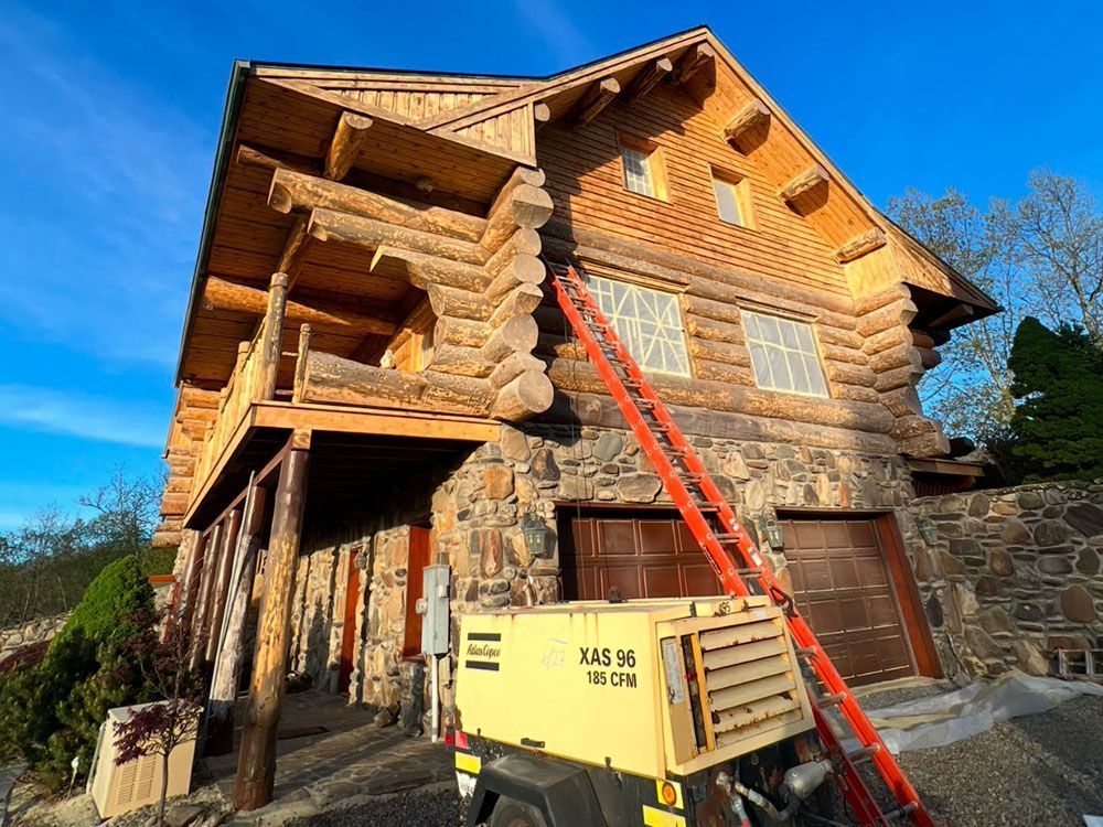 Our crushed glass blasting process removes all existing coatings and deteriorated wood fibers, taking your logs back to a clean, solid surface—the ideal foundation for proper borate treatment, sealing, and long-lasting stain application. Contact us today to get started.